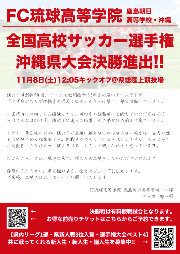 決勝も引き続きFC琉球高等学院 鹿島朝日高等学校沖縄サッカー部への応援をよろしくお願いいたします。